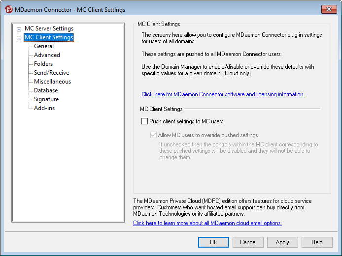 Use the MC Client Settings dialog to centrally manage the client settings of your MDaemon Connector (MC) users. Configure each screen with your desired client settings and MDaemon will push those settings to the corresponding client screens as necessary, each time an MC user connects to the server. The MC Client Settings are only sent to clients when one of the settings has changed since the last time the client connected and received them. If the option below to "Allow MC users to override pushed settings" is enabled, users can override any pushed settings on their individual clients. If that option is disabled, then all of the client screens are locked; MC users can make no changes.