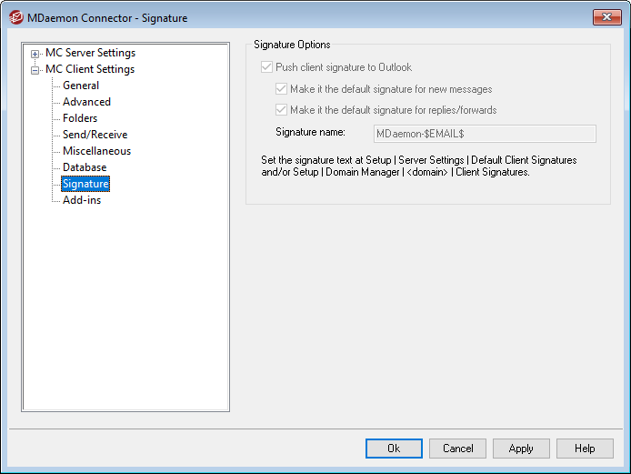 Enable this option if you wish to push the default client signature (or domain-specific client signature, if one has been created) to your MDaemon Connector users. Designate a name for the signature in the Signature name option below.
