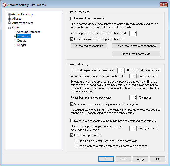 By default, MDaemon requires strong passwords when creating new accounts or changing existing passwords. Clear this check box if you wish to disable the strong password requirement.