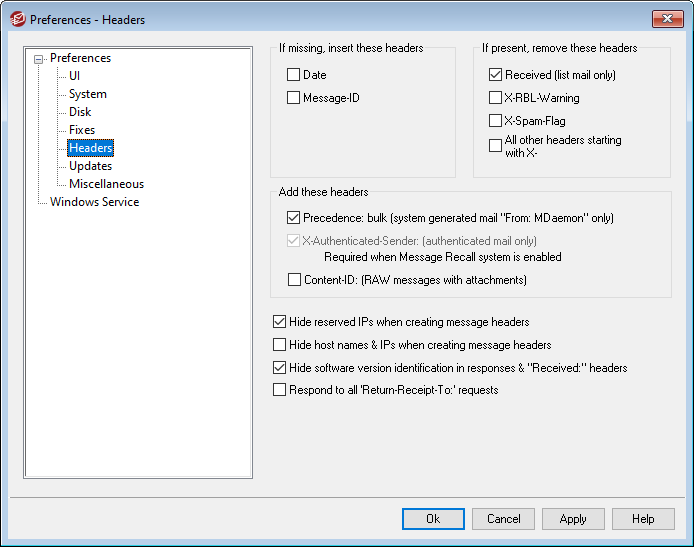 MDaemon and other mail servers use many server specific headers called X-Type headers in order to route mail and perform various other functions. When this option is enabled, MDaemon will strip these headers from messages. Note: this option does not remove X-RBL-Warning headers. If you wish to remove those headers, use the "X-RBL-Warning" option above.
