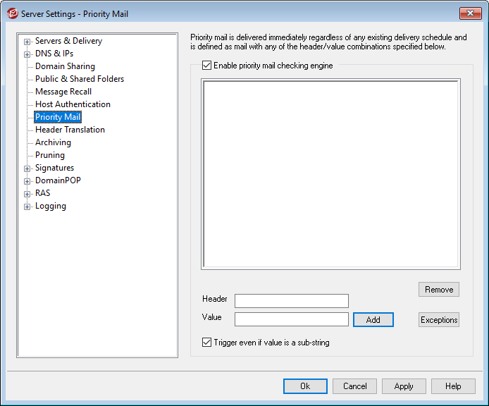 After entering the Header/Value information in the specified text boxes, and after specifying whether this entry will apply to sub-strings, click the Add button to create the new Priority Mail entry.