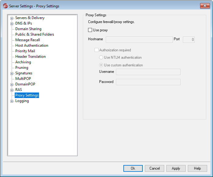 If you are running MDaemon behind a firewall or proxy server, you can use this dialog to configure MDaemon to use the proxy when necessary to make various http requests, such as when checking for AntiVirus updates and performing some other normal maintenance tasks. The Proxy Settings dialog provides options for entering the proxy server's hostname and port, and if authentication is required, you can elect to use Windows NTLM authentication or custom authentication, entering a username and password.