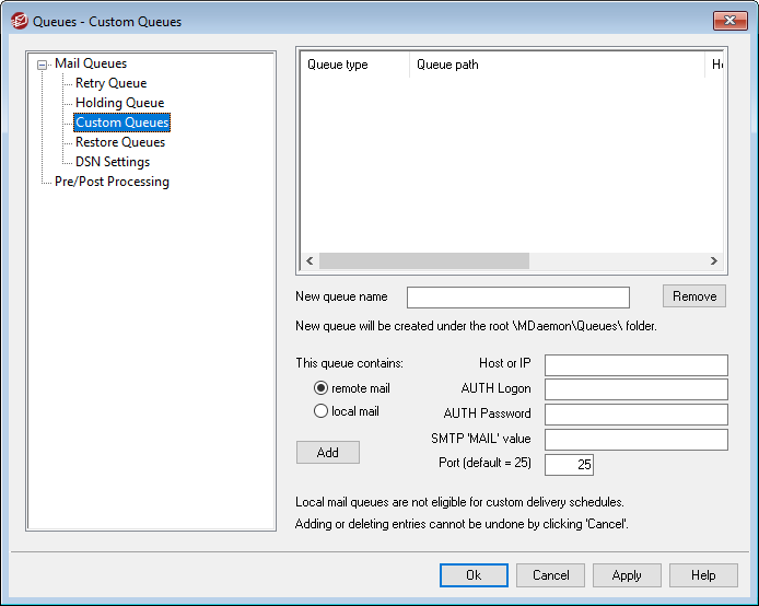 Use the Custom Queues dialog under Queues » Mail Queues to create custom local and remote mail queues. Custom queue support makes it possible for you to have MDaemon monitor several locations from which to send mail. You can create new queues and designate them as local or remote, and you can then use Content Filter rules to cause messages to be automatically placed into your custom mail queues, and for remote queues you can use the Event Scheduler to create custom schedules to control how often those queues will be processed.