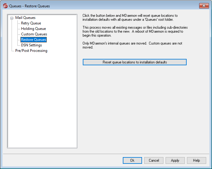 By default, a new installation of MDaemon stores message queues such as Remote, Local, Raw, and the like under the \MDaemon\Queues\ subfolder. Previous versions of MDaemon stored queues elsewhere. If your installation of MDaemon is using the old folder locations and you would like to move your queues to this more organized structure then click this button and all queues and the files and messages they contain will be moved for you. After clicking this button you will need to restart MDaemon for the changes to be implemented.