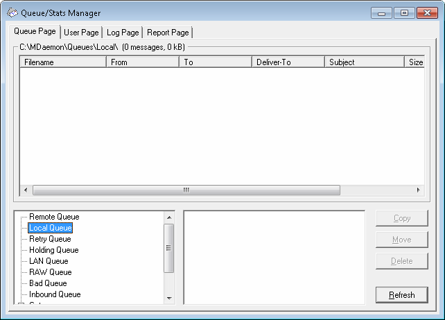 Mail queues are dynamic while MDaemon is active - with message files constantly being transferred to and from them. For this reason you should be aware that when copying, moving, or deleting files you may at times encounter a message stating that the action that you are attempting cannot be completed. This will occur when the message file that you are attempting to work with has already been removed by MDaemon before the desired action has begun. By clicking the Refresh button, you can update the current list of files displayed in the list box. You can prevent messages from being moved out of the queue while you are editing them by editing the MDstats.ini file. To do this simply open the MDstats.ini file located in MDaemon's \app\ directory and change the LockOnEdit=No key under the [QueueOptions] heading to LockOnEdit=Yes. This will cause a LCK file to be created whenever you are editing a message, which will prevent it from being moved out of the queue until you are finished with it. |