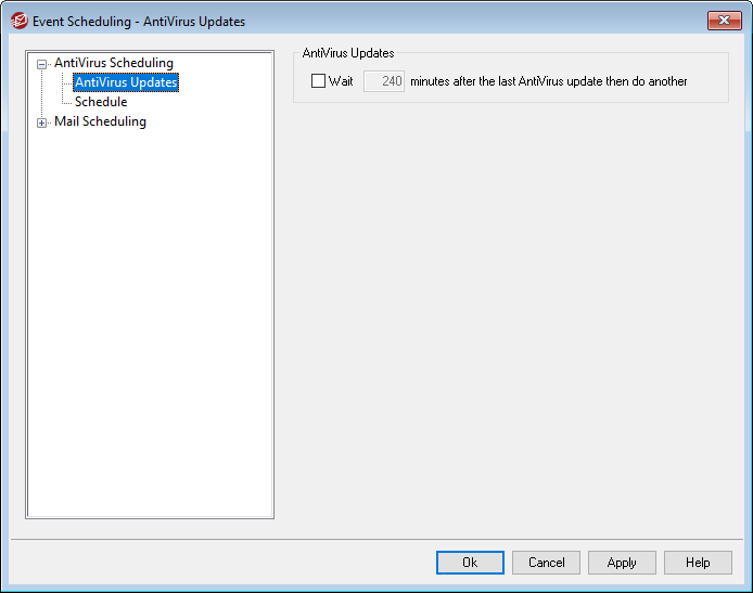 Click this checkbox and specify the number of minutes that you want AntiVirus to wait before checking for new virus signature updates. Note, this is actually the number of minutes that AntiVirus will attempt to wait after the last time you checked for an update, whether the update was triggered by the scheduler or manually. The scheduler and manually triggered updates are given precedence over this setting and will therefore reset this counter if an AntiVirus update event is triggered by one of those other methods. Thus, for example, if you have this option set to check for updates every 240 minutes and you manually check for an update after 100 minutes, this counter will be reset to 240.