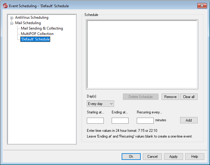 Depending on your needs, it may be sufficient to use the simple scheduling options on the Mail Sending & Collecting screen to control mail processing intervals. For example, it is pointless to make a specific schedule with events for every minute of every day when you can simply set the slider bar on Mail Sending & Collecting to one minute intervals and accomplish the same thing. On the other hand, if you want the processing intervals to be more than an hour apart, or only on certain days, then you can use some combination of the scheduling options and specific times. |