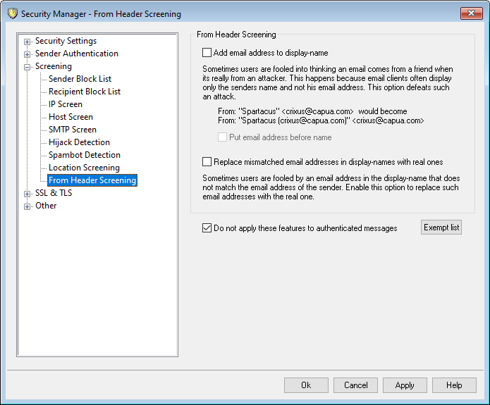 Check this box if you do not wish to apply the From Header Screening options to incoming messages that have been authenticated by MDaemon.
