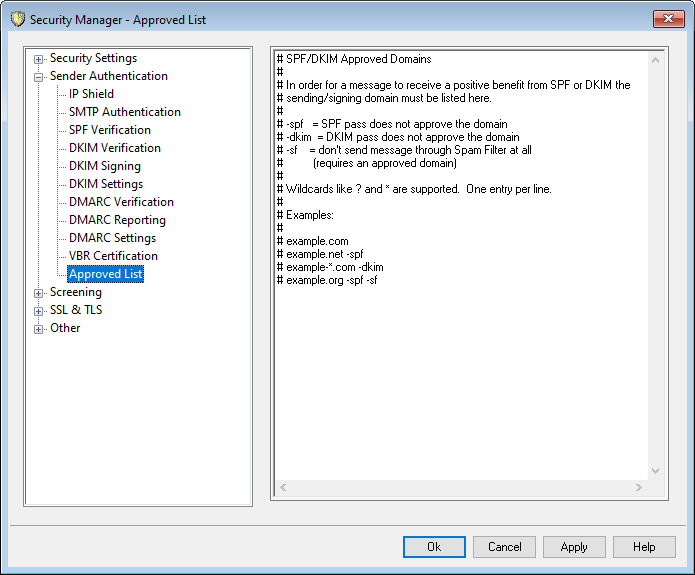 Because some spammers and senders of bulk email have begun using SPF or signing messages with a valid DKIM signature, the fact that a message is signed and verified is no guarantee that you won't consider it to be spam, even though it does ensure that the message originated from a valid source. For this reason, a message's spam score will not be lowered as a result of SPF or DKIM verification unless the domain taken from the signature is on the Approved List. This is essentially an allow list that you can use to designate domains permitted to have their messages' spam scores reduced when those incoming messages are verified.
