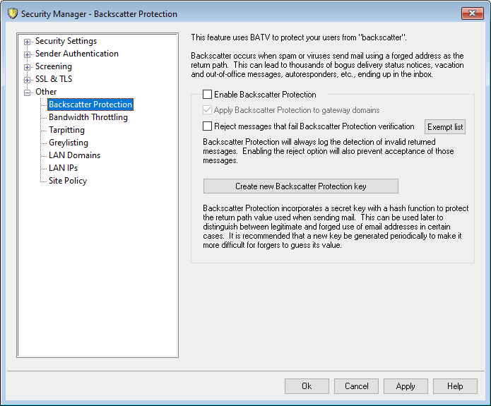 When you enable Backscatter Protection, you should wait about a week before setting it to reject invalid auto-response messages. This is because during that time you might still receive DSNs or auto-responses to messages that were sent out before BP was activated. If BP were configured to reject invalid message during that time then those legitimate response messages would be rejected by mistake. After a week it should be safe to start rejecting invalid messages. This same warning applies when you create a new BP key and choose to delete the old key immediately instead of allowing it to continue working for another seven days. (see the Create new Backscatter Protection key option below).