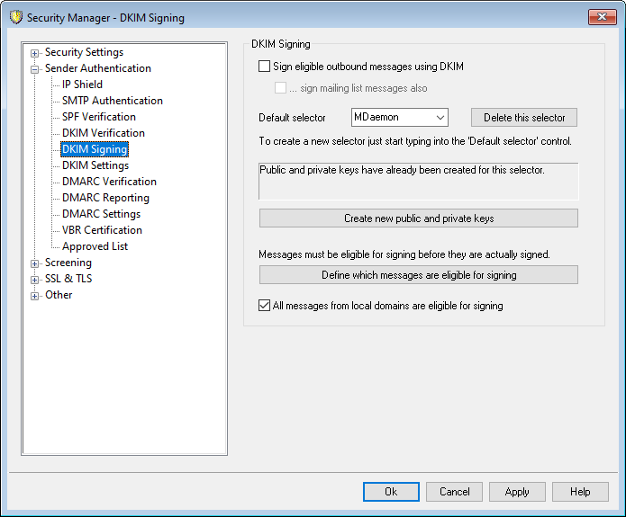 Use the options contained on the DKIM Signing screen to configure MDaemon to sign eligible outbound messages using DKIM, and to define the criteria that will make a message eligible. You can also use this screen to designate selectors and generate corresponding public and private keys suitable for use with the DKIM specification. A default selector ("MDaemon") and a default public and private key are created for you automatically on startup. All keys are unique—they are never the same from one site to another, regardless of the selector specified. By default, keys are generated with a secure bit depth of 2048 bits.