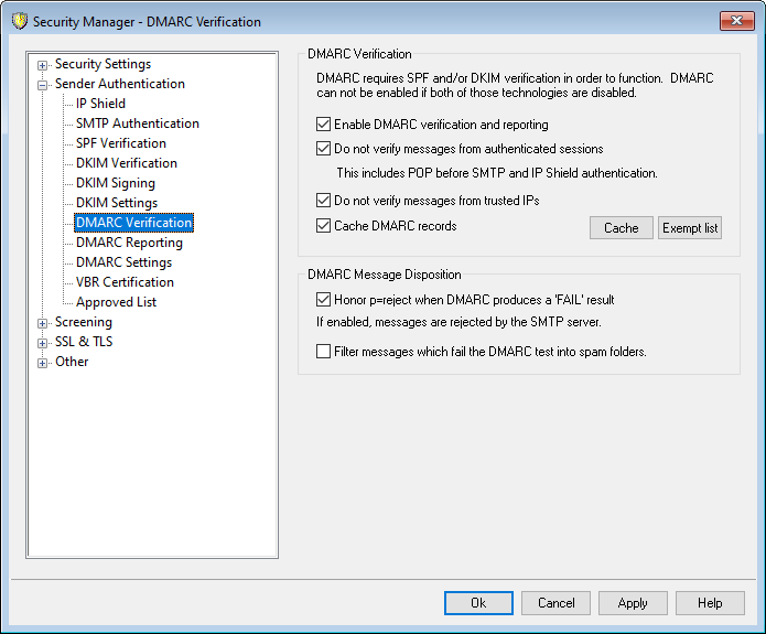 Click this button to open the DMARC exempt list. Messages originating from any IP addresses specified on the list will not be subject to DMARC verification.
