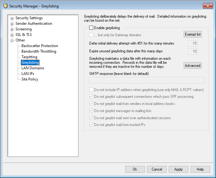 Greylisting is located under the Security dialog at: Security » Security Settings » Other » Greylisting. Greylisting is a spam-fighting technique that exploits the fact that SMTP servers retry delivery of any message that receives a temporary (i.e. "try again later") error code. Using this technique, when a message arrives from a sender not on the allow list or otherwise previously unknown, its sender, recipient, and sending server's IP address will be logged and then the message will be refused by Greylisting during the SMTP session with a temporary error code. Furthermore, for a designated period of time (say, 15 minutes) any future delivery attempts will also be temporarily refused. Because "spammers" do not typically make further delivery attempts when a message is refused, greylisting can significantly help to reduce the amount of spam your users receive. But, even if the spammers should attempt to retry delivery at a later time, it is possible that by that time the spammers will have been identified and other spam-fighting options (such as DNS Block Lists) will successfully block them. It's important to note, however, that this technique can deliberately delay "good" email along with the "bad". But, the legitimate messages should still be delivered sometime later after the greylisting period has expired. It is also important to note that you have no way of knowing how long the sending servers will wait before making further delivery attempts. It is possible that purposely refusing a message with a temporary error code could cause it to be delayed by as little as just a few minutes or by as much as an entire day.
