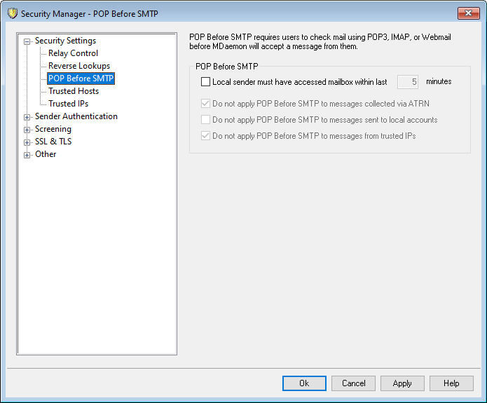 If this checkbox is enabled, messages arriving from an IP address listed on the Trusted Domains screen will be exempt from POP Before SMTP.