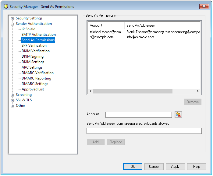 Accounts can normally only send mail from their own email address or aliases. If, however, there are MDaemon accounts that you would like to give permission to "send as" other accounts, then use this page to set that up. For example, you could give a manager's assistant permission to send messages as if they are coming from the manager's account, or you could use a wildcard address, such as "*@example.com," to give all users of a specific domain permission to send from a specific address, such as "info@example.com". To do so, simply use the options on this page to select the account and then list the Send As Addresses from which that account will be able to send messages. This will allow the designated accounts to send mail from those addresses instead of being blocked by the "Credentials used must match those of the return-path address" and "Credentials used must match those of the 'From:' header address" requirements on the SMTP Authentication screen.