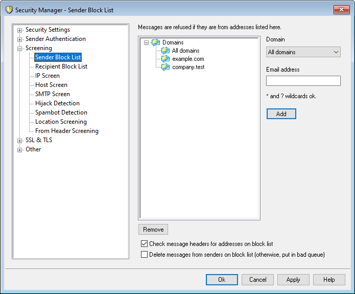 The Sender Block List is located at: Security » Security Settings » Screening. This list contains addresses that are not allowed to send mail traffic through your server. If a message arrives from an address on this list, it will be refused during the SMTP session. This is useful for controlling problem users. Addresses may be blocked on a per domain basis or globally (applied to all MDaemon domains).
