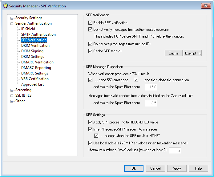 By default authenticated connections are exempt from SPF queries. Authenticated sessions include those verified via SMTP Authentication, POP before SMTP, or the IP Shield. Disable this option if you do not wish to exempt authenticated sessions from SPF.
