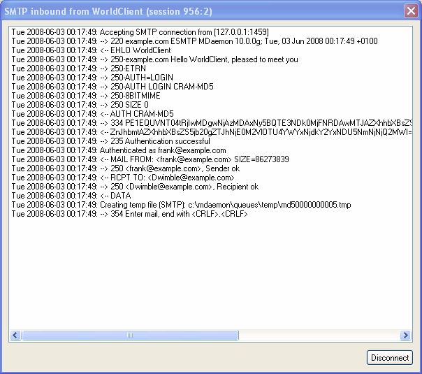 When you double-click an active session on one of the Session tabs of the main GUI, this will open the session window corresponding to that entry. The session window will display the SMTP transcript of that session as it progresses. You can click Disconnect on this window if you wish to interrupt and disconnect that session in progress.