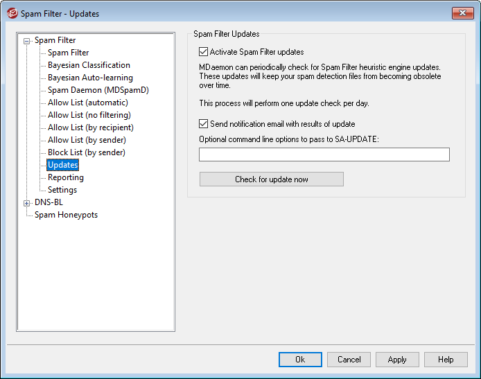 Click this check box if you want the Spam Filter be updated automatically. Once per day MDaemon will to see if there are any updates available for the Spam Filter heuristics engine, and if so it will download and install them automatically.
