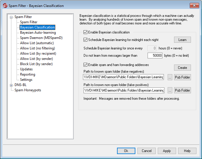 If you rename a Public folder via a mail client, Windows Explorer, or some other means, then you must manually reset this path to the appropriate new folder name. If you rename a folder but do not change its path here, the Spam Filter will continue to use this path for the Bayesian folder instead of the new one. |