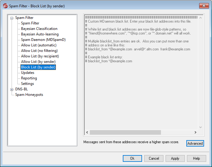 Click Advanced to add addresses to this list. Messages from addresses on this block list will have their Spam Filter score increased by the amount specified on the Spam Filter Settings screen, typically causing them to be marked as spam. However, including an address on this list does not automatically guarantee that a message from that address will always be considered spam. For example, if a message comes from a blocked sender but is addressed to an allowed recipient, then the score modifiers may offset each other and cause the message to have a final score that is below the spam score threshold. This could also happen if you have the block list score modifier set particularly low.