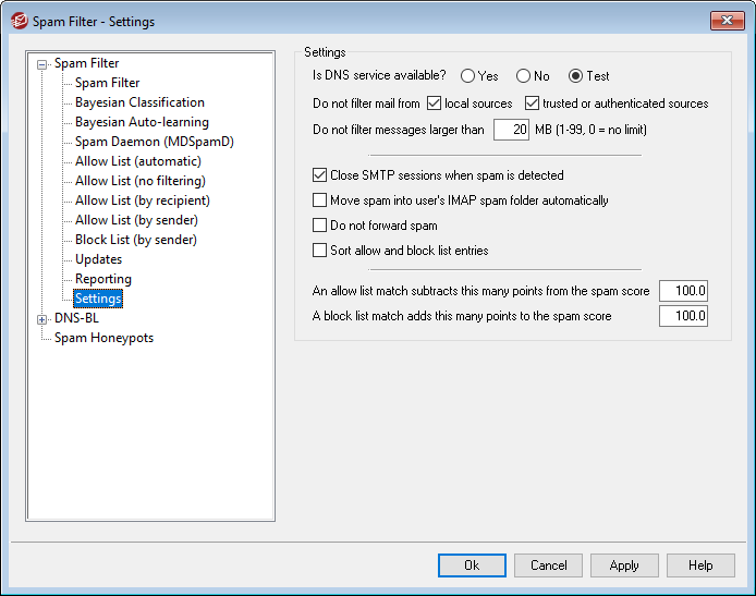 These options allow you to choose whether or not DNS is available to the Spam Filter when processing messages. You may choose one of the following options: