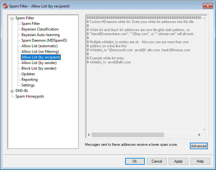 Click Advanced to add addresses to this list. This list is similar to Allow List (no filtering), except that rather than exempting messages for the recipient from Spam Filter processing, they will be processed but have their Spam Filter score reduced by the amount specified on the Spam Filter Settings screen. Therefore including an address on this allow list does not automatically guarantee that a message to that address will not be considered spam. For example, if you have the spam score threshold set to 5.0 and the allow list value set to 100, and then a particularly excessive spam message arrives that gets a spam score of 105.0 or higher before the allow list value is subtracted, then the final spam score of the message will be at least 5.0, thus denoting it as spam. This is highly unlikely, however, because spam rarely has a value that high unless it contains some other exceptionally high-scoring element, such as a blocked address.
