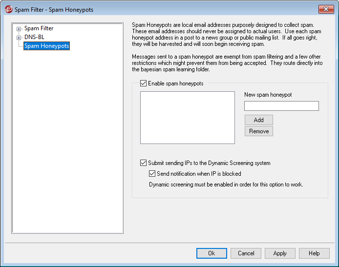 Spam Honeypots (located at Security » Spam Filter » Spam Honeypots) is for designating local email addresses purposely designed to collect spam. These spam honeypots are not valid MDaemon accounts or address aliases and should never be used for sending or receiving legitimate email. But, by posting a honeypot address to a news group, public mailing list, or other source from which spammers often farm addresses, you should begin to see incoming messages addressed to the spam honeypots — you could also pull addresses from other spam that you have received addressed to other invalid local addresses. Because honeypots will never receive legitimate email, all incoming messages addressed to them will always be routed directly to your Bayesian spam learning folder for processing. Further, the IP addresses of the sending servers can optionally be added to the Dynamic Screening system, banning future connections from those addresses for a designated period of time. All of this helps increase the probability of identifying and blocking spam in the future.