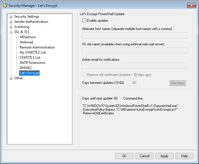 To support using Let's Encrypt's automated process to manage a certificate, this screen is provided to help you easily configure and run the PowerShell script included in the "MDaemon\LetsEncrypt" folder. Running the script will set up everything for Let's Encrypt, including putting the necessary files in the Webmail HTTP folder to complete the http-01 challenge. It uses the SMTP host name of the default domain as the domain for the certificate, includes any Alternate host names you have specified, retrieves the certificate, imports it into Windows, and configures MDaemon to use the certificate for MDaemon, Webmail, and Remote Administration. Further, the script creates a log file in the "MDaemon\Logs\" folder, called LetsEncrypt.log. This log file is removed and recreated each time the script runs, and it includes the starting date and time of the script. Also, notification emails will be sent when errors occur if you specify an Admin email for notifications.