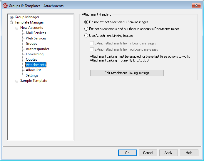 If this option is selected, attachments will not be extracted from a template-controlled account's messages. Messages with attachments will be handled normally, leaving the attachments intact.