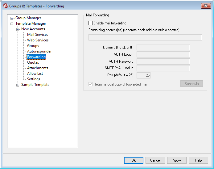 The options on this template screen correspond to the options located on the Account Editor's Forwarding screen. When a template is set to control this screen, it will control the Forwarding options for any account belonging to a Group that utilizes the template.