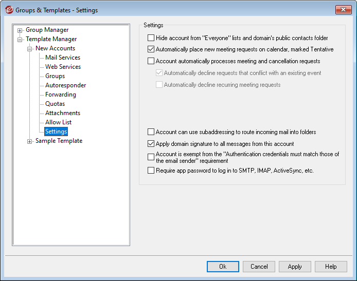 The options on this template screen correspond to the settings located on the Account Editor's Settings screen. When a template is set to control this screen, it will control the Settings screen for any account belonging to a Group that utilizes the template.