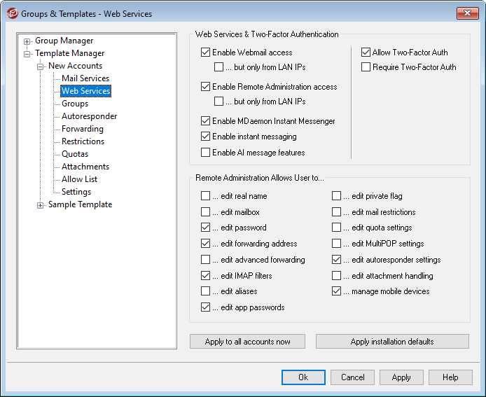 This option is only available on the New Accounts Template. Click it to apply the settings on this screen to all existing MDaemon accounts that are not specifically controlled by a Web Services Account Template.