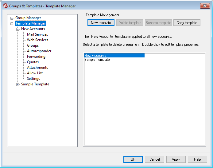 With the Template Manager (Accounts » Groups & Templates... » Template Manager) you can create and manage Account Templates, which are named sets of account settings that can be assigned to specific Groups. Any account belonging to one or more of those groups will have the designated account settings locked, being controlled only by the assigned templates rather than by the Account Editor. The categories of account settings that a template will control are designated on each template's properties screen, which is reached by double-clicking the template's name in the list below, or by clicking the template in the left pane.