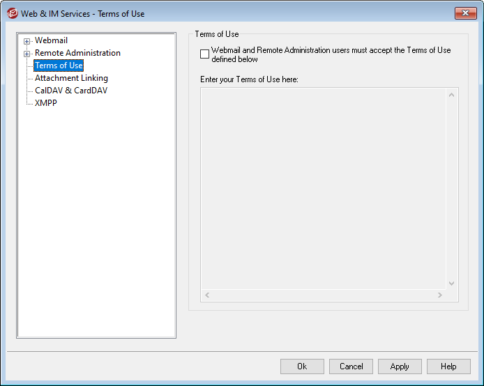 Check this box and enter your Terms of Use statement in the space provided if you wish to require Webmail and Remote Administration users to accept the Terms of Use statement each time they sign in.
