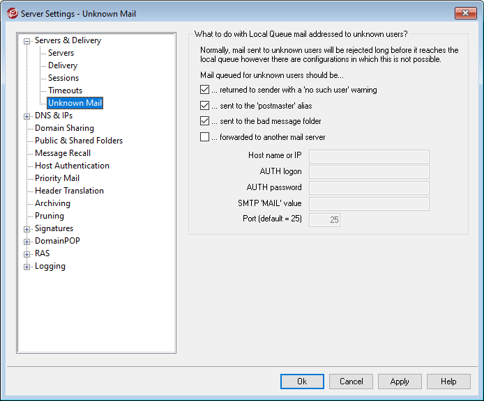 Use this option if you wish to forward messages to another mail server when they are addressed to unknown local users.