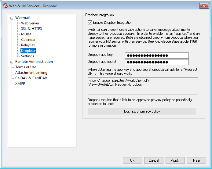 The App key and App secret are located on your app's info page at Dropbox.com. Enter them here to link Webmail to your Dropbox app.