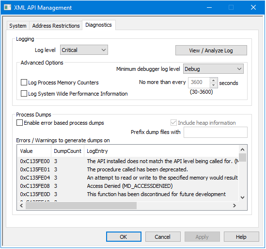 Right-click this area and use the Add/Edit/Delete Entry... options to manage the list of errors or warnings that will trigger process dumps. For each entry you can specify the number of process dumps allowed before it will be deactivated.
