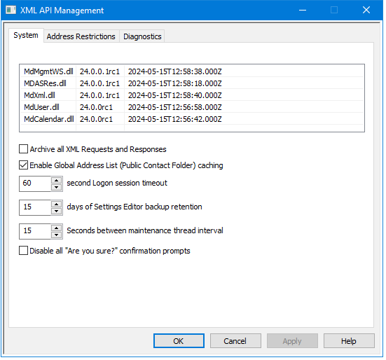 This dialog contains various management settings for MDaemon's XML API service. For more on MDaemon's API library and integrating your custom applications with MDaemon, see: MD-API.html (located in the \..\MDaemon\Docs\API folder).