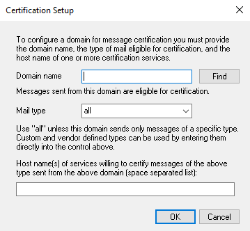 After enabling the Insert certification data into outgoing messages option above, click this button to open the Certification Setup dialog. On this dialog you will designate the domain whose outbound messages will be certified, the types of mail that will be certified, and the CSPs associated with the domain.